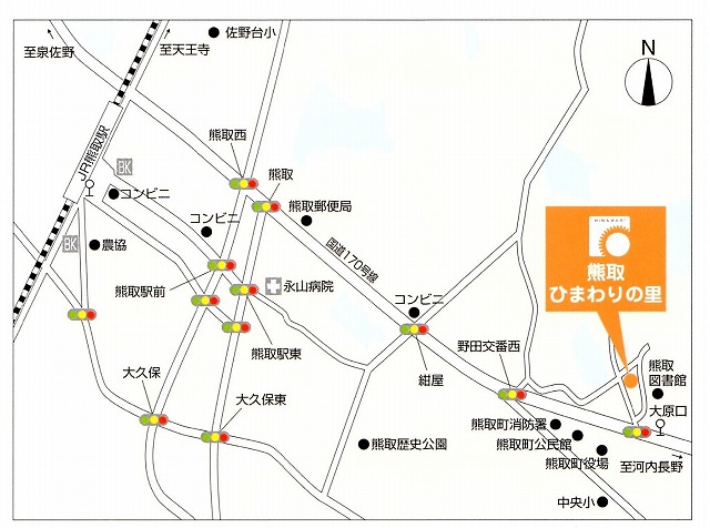 | 「交通機関」 ●徒歩にてお越しの場合(1.7km約20分) JR熊取駅より東方向へまっすぐ約400m進み熊取駅前交差点を左に曲がる。 北方向へ約150m進み、熊取西交差点を右に曲がる。 そのまま170号線沿いに直進すること約1km。熊取図書館前左に曲がる。 ●バスにてお越しの場合(約10分) JR熊取駅乗車(南海バスニュータウン行き)→大原口下車 熊取図書館前 ●お車にてお越しの場合 国道170号線でJR阪和線の高架から水間方面に向かい、約1.3km。 熊取図書館前を左に曲がりすぐ。 (国道右側は熊取町役場、公民館、消防署等公共施設有り) |